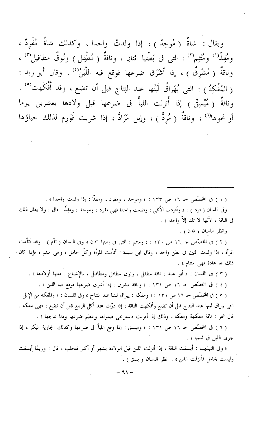 ويقال: شاةٌ (مُوحِدٌ)، إذا ولدتْ واحداً، وكذلك شاةٌ مُفرِدٌ، ومُفِذّ ومُتئِم: التي في بطنها اثنانِ، وناقةٌ (مُطْفِل) ونُوقٌ مطافيل، وناقةٌ (مُشرِقٌ)، إذا أشَرَق ضرعها فوقع فيه اللَّبَنُ. وقال أبو زيد: (المُفْكِهُ): التي يُهَراقُ لبَنُها عند النِتاج قبل أن تضع، وقد أفكهت. وناقةٌ (مُبسِقٌ) إذا أنزلت اللبأ في ضرعها قبل ولادها بعشرين يوماً أو نحوها، وناقةٌ (مُرِدٌّ)، وإبل مَرَادُّ، إذا شربت فَوَرِم لذلك حياؤها