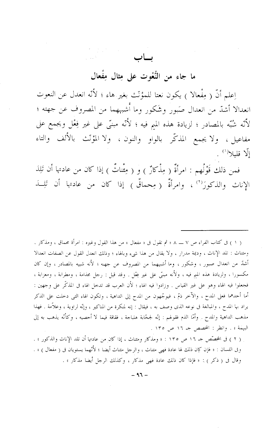اعلم أن (مِفْعالا) يكون نعتاً للمؤنث بغير هاء؛ لأنه انعدل عن النعوت انعدالاً أشد من انعدال صَبور وشَكور وما أشبههما من المصروف عن جهته؛ لأنه شُبِّه بالمصادر؛ لزيادة هذه الميم فيه؛ لأنه مبني على غير فِعْل ويجمع على مفاعيل، ولا يجمع المذكر بالواو والنون، ولا المؤنث بالألف والتاء إلا قليلاً.