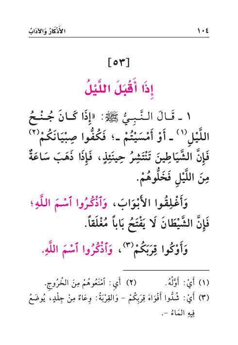 ١ - قَالَ النَّبِيُّ صَلَّى اللهُ عَلَيْهِ وَسَلَّمَ: «إِذَا كَانَ جُنْحُ اللَّيْلِ (¬١) - أَوْ أَمْسَيْتُمْ -؛ فَكُفُّوا صِبْيَانَكُمْ (¬٢) فَإِنَّ الشَّيَاطِينَ تَنْتَشِرُ حِينَئِذٍ، فَإِذَا ذَهَبَ سَاعَةٌ مِنَ اللَّيْلِ فَخَلُّوهُمْ.
