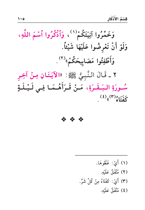 ٢ - قَالَ النَّبِيُّ صَلَّى اللهُ عَلَيْهِ وَسَلَّمَ: «الآيَتَانِ مِنْ آخِرِ سُورَةِ البَقَرَةِ، مَنْ قَرَأَهُمَا فِي لَيْلَةٍ كَفَتَاهُ (¬٣) » (¬٤) .