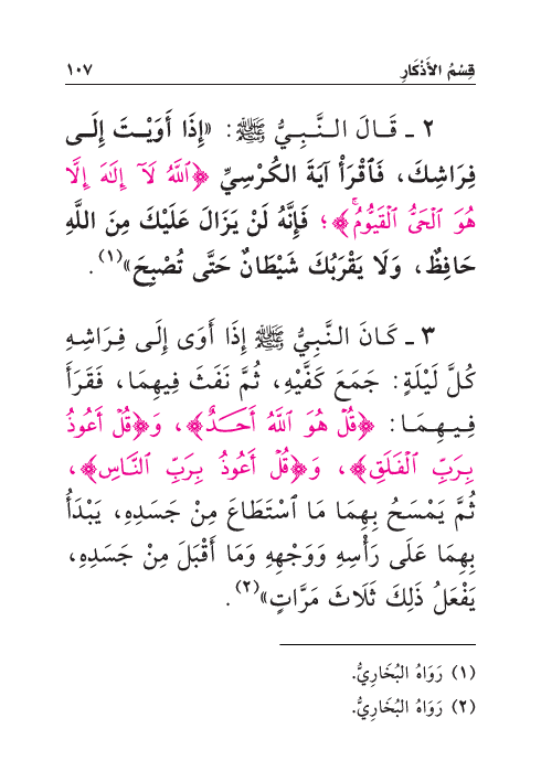 ٢ - قَالَ النَّبِيُّ صَلَّى اللهُ عَلَيْهِ وَسَلَّمَ: «إِذَا أَوَيْتَ إِلَى فِرَاشِكَ، فَاقْرَأْ آيَةَ الكُرْسِيِّ {اللَّهُ لَا إِلَهَ إِلَّا هُوَ الْحَيُّ الْقَيُّومُ}؛ فَإِنَّهُ لَنْ يَزَالَ عَلَيْكَ مِنَ اللَّهِ حَافِظٌ، وَلَا يَقْرَبُكَ شَيْطَانٌ حَتَّى تُصْبِحَ» (¬١) .