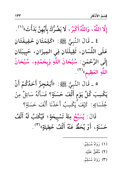 ٤ - قَالَ النَّبِيُّ صَلَّى اللهُ عَلَيْهِ وَسَلَّمَ: «كَلِمَتَانِ خَفِيفَتَانِ عَلَى اللِّسَانِ، ثَقِيلَتَانِ فِي المِيزَانِ، حَبِيبَتَانِ إِلَى الرَّحْمَنِ: سُبْحَانَ اللَّهِ وَبِحَمْدِهِ، سُبْحَانَ اللَّهِ العَظِيمِ» (¬٢) .