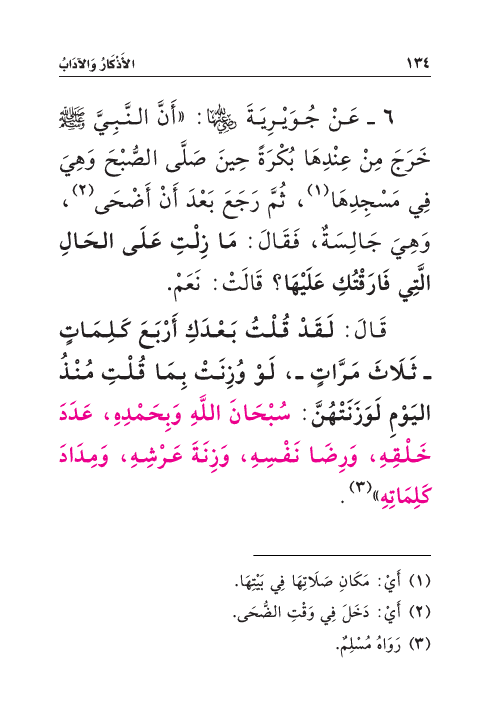 قَالَ: لَقَدْ قُلْتُ بَعْدَكِ أَرْبَعَ كَلِمَاتٍ - ثَلَاثَ مَرَّاتٍ -، لَوْ وُزِنَتْ بِمَا قُلْتِ مُنْذُ اليَوْمِ لَوَزَنَتْهُنَّ: سُبْحَانَ اللَّهِ وَبِحَمْدِهِ، عَدَدَ خَلْقِهِ، وَرِضَا نَفْسِهِ، وَزِنَةَ عَرْشِهِ، وَمِدَادَ كَلِمَاتِهِ» (¬٣) .