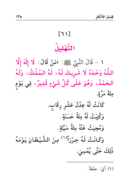 ١ - قَالَ النَّبِيُّ صَلَّى اللهُ عَلَيْهِ وَسَلَّمَ: «مَنْ قَالَ: لَا إِلَهَ إِلَّا اللَّهُ وَحْدَهُ لَا شَرِيكَ لَهُ، لَهُ المُلْكُ، وَلَهُ الحَمْدُ، وَهُوَ عَلَى كُلِّ شَيْءٍ قَدِيرٌ، فِي يَوْمٍ مِئَةَ مَرَّةٍ.