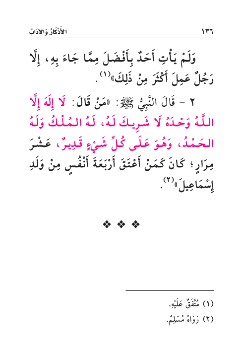 ٢ - قَالَ النَّبِيُّ صَلَّى اللهُ عَلَيْهِ وَسَلَّمَ: «مَنْ قَالَ: لَا إِلَهَ إِلَّا اللَّهُ وَحْدَهُ لَا شَرِيكَ لَهُ، لَهُ المُلْكُ وَلَهُ الحَمْدُ، وَهُوَ عَلَى كُلِّ شَيْءٍ قَدِيرٌ، عَشْرَ مِرَارٍ؛ كَانَ كَمَنْ أَعْتَقَ أَرْبَعَةَ أَنْفُسٍ مِنْ وَلَدِ إِسْمَاعِيلَ» (¬٢) .