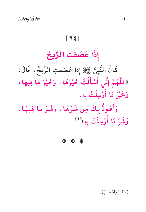 كَانَ النَّبِيُّ صَلَّى اللهُ عَلَيْهِ وَسَلَّمَ إِذَا عَصَفَتِ الرِّيحُ، قَالَ: «اللَّهُمَّ إِنِّي أَسْأَلُكَ خَيْرَهَا، وَخَيْرَ مَا فِيهَا، وَخَيْرَ مَا أُرْسِلَتْ بِهِ.