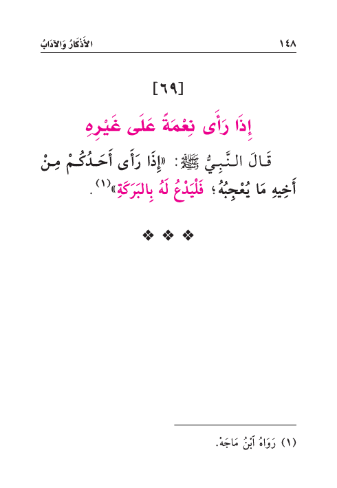 قَالَ النَّبِيُّ صَلَّى اللهُ عَلَيْهِ وَسَلَّمَ: «إِذَا رَأَى أَحَدُكُمْ مِنْ أَخِيهِ مَا يُعْجِبُهُ؛ فَلْيَدْعُ لَهُ بِالبَرَكَةِ» (¬١) .