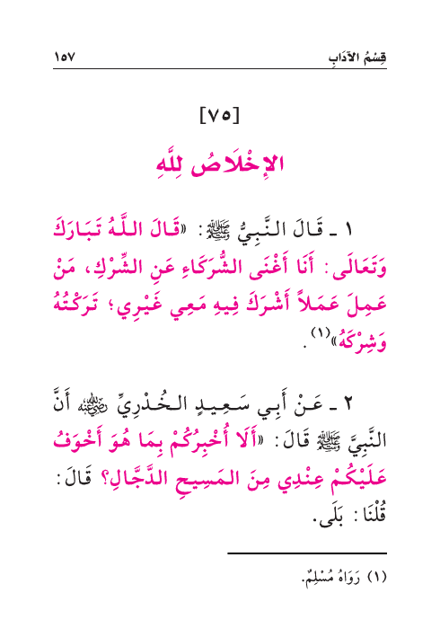 ٢ - عَنْ أَبِي سَعِيدٍ الخُدْرِيُّ رَضِيَ اللهُ عَنْهُ أَنَّ النَّبِيَّ صَلَّى اللهُ عَلَيْهِ وَسَلَّمَ قَالَ: «أَلَا أُخْبِرُكُمْ بِمَا هُوَ أَخْوَفُ عَلَيْكُمْ عِنْدِي مِنَ المَسِيحِ الدَّجَّالِ؟ قَالَ: قُلْنَا: بَلَى.