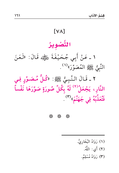 ١ - عَنْ أَبِي جُحَيْفَةَ رَضِيَ اللهُ عَنْهُ قَالَ: «لَعَنَ النَّبِيُّ صَلَّى اللهُ عَلَيْهِ وَسَلَّمَ المُصَوِّرَ» (¬١) .