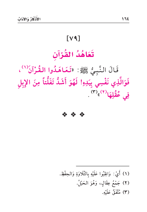 قَالَ النَّبِيُّ صَلَّى اللهُ عَلَيْهِ وَسَلَّمَ: «تَعَاهَدُوا القُرْآنَ (¬١) ، فَوَالَّذِي نَفْسِي بِيَدِهِ! لَهُوَ أَشَدُّ تَفَلُّتاً مِنَ الإِبِلِ فِي عُقُلِهَا (¬٢) » (¬٣) .