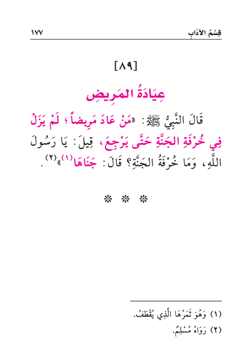 قَالَ النَّبِيُّ صَلَّى اللهُ عَلَيْهِ وَسَلَّمَ: «مَنْ عَادَ مَرِيضاً؛ لَمْ يَزَلْ فِي خُرْفَةِ الجَنَّةِ حَتَّى يَرْجِعَ، قِيلَ: يَا رَسُولَ اللَّهِ، وَمَا خُرْفَةُ الجَنَّةِ؟ قَالَ: جَنَاهَا (¬١) » (¬٢) .