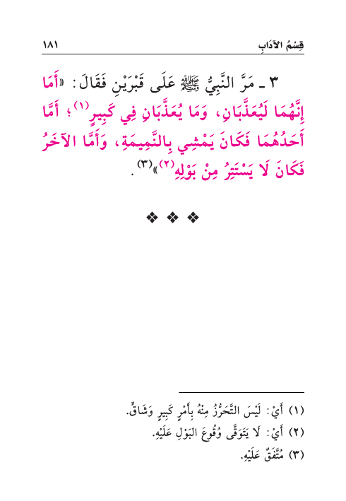 ٣ - مَرَّ النَّبِيُّ صَلَّى اللهُ عَلَيْهِ وَسَلَّمَ عَلَى قَبْرَيْنِ فَقَالَ: «أَمَا إِنَّهُمَا لَيُعَذَّبَانِ، وَمَا يُعَذَّبَانِ فِي كَبِيرٍ (¬١) ؛ أَمَّا أَحَدُهُمَا فَكَانَ يَمْشِي بِالنَّمِيمَةِ، وَأَمَّا الآخَرُ فَكَانَ لَا يَسْتَتِرُ مِنْ بَوْلِهِ (¬٢) » (¬٣) .