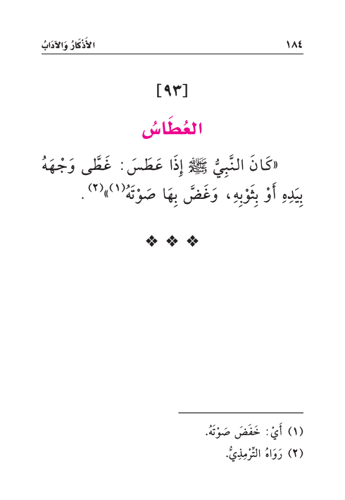 «كَانَ النَّبِيُّ صَلَّى اللهُ عَلَيْهِ وَسَلَّمَ إِذَا عَطَسَ: غَطَّى وَجْهَهُ بِيَدِهِ أَوْ بِثَوْبِهِ، وَغَضَّ بِهَا صَوْتَهُ (¬١) » (¬٢) .