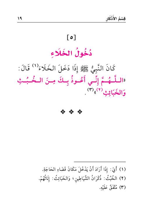 كَانَ النَّبِيُّ صَلَّى اللهُ عَلَيْهِ وَسَلَّمَ إِذَا دَخَلَ الخَلَاءَ (¬١) قَالَ: «اللَّهُمَّ إِنِّي أَعُوذُ بِكَ مِنَ الخُبُثِ وَالخَبَائِثِ (¬٢) » (¬٣) ٣).