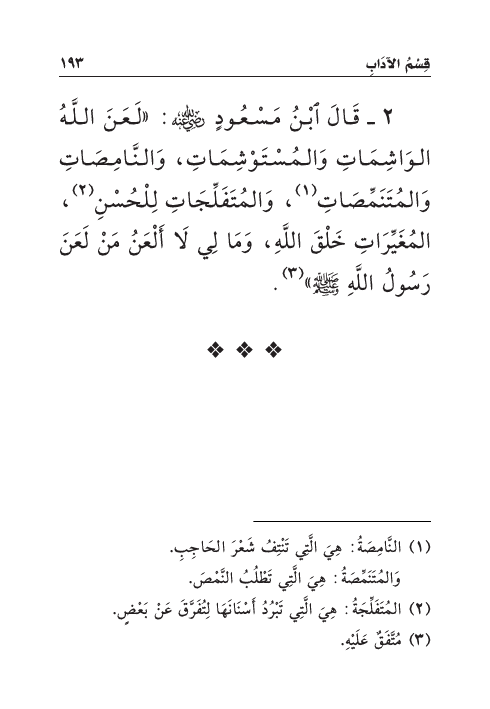 ٢ - قَالَ ابْنُ مَسْعُودٍ رَضِيَ اللهُ عَنْهُ: «لَعَنَ اللَّهُ الوَاشِمَاتِ وَالمُسْتَوْشِمَاتِ، وَالنَّامِصَاتِ وَالمُتَنَمِّصَاتِ (¬١) ، وَالمُتَفَلِّجَاتِ لِلْحُسْنِ (¬٢) ، المُغَيِّرَاتِ خَلْقَ اللَّهِ، وَمَا لِي لَا أَلْعَنُ مَنْ لَعَنَ رَسُولُ اللَّهِ صَلَّى اللهُ عَلَيْهِ وَسَلَّمَ» (¬٣) .