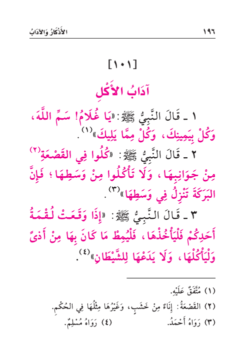 ١ - قَالَ النَّبِيُّ صَلَّى اللهُ عَلَيْهِ وَسَلَّمَ: «يَا غُلَامُ! سَمِّ اللَّهَ، وَكُلْ بِيَمِينِكَ، وَكُلْ مِمَّا يَلِيكَ» (¬١) .