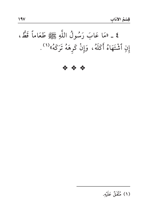 ٤ - «مَا عَابَ رَسُولُ اللَّهِ صَلَّى اللهُ عَلَيْهِ وَسَلَّمَ طَعَاماً قَطُّ، إِنِ اشْتَهَاهُ أَكَلَهُ، وَإِنْ كَرِهَهُ تَرَكَهُ» (¬١) .