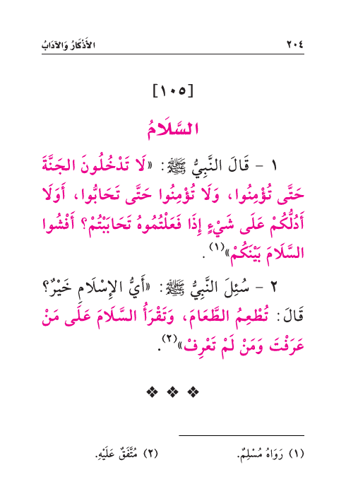 ١ - قَالَ النَّبِيُّ صَلَّى اللهُ عَلَيْهِ وَسَلَّمَ: «لَا تَدْخُلُونَ الجَنَّةَ حَتَّى تُؤْمِنُوا، وَلَا تُؤْمِنُوا حَتَّى تَحَابُّوا، أَوَلَا أَدُلُّكُمْ عَلَى شَيْءٍ إِذَا فَعَلْتُمُوهُ تَحَابَبْتُمْ؟ أَفْشُوا السَّلَامَ بَيْنَكُمْ» (¬١) .
