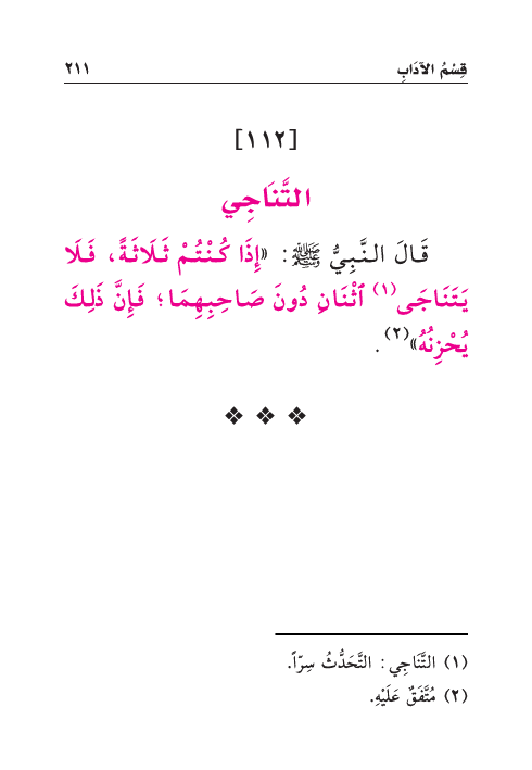 قَالَ النَّبِيُّ صَلَّى اللهُ عَلَيْهِ وَسَلَّمَ: «إِذَا كُنْتُمْ ثَلَاثَةً، فَلَا يَتَنَاجَى (¬١) اثْنَانِ دُونَ صَاحِبِهِمَا؛ فَإِنَّ ذَلِكَ يُحْزِنُهُ» (¬٢) .