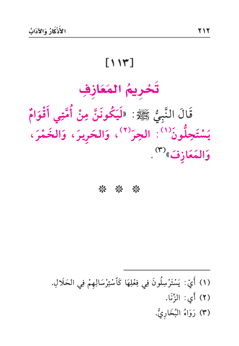 قَالَ النَّبِيُّ صَلَّى اللهُ عَلَيْهِ وَسَلَّمَ: «لَيَكُونَنَّ مِنْ أُمَّتِي أَقْوَامٌ يَسْتَحِلُّونَ (¬١) : الحِرَ (¬٢) ، وَالحَرِيرَ، وَالخَمْرَ، وَالمَعَازِفَ» (¬٣) .