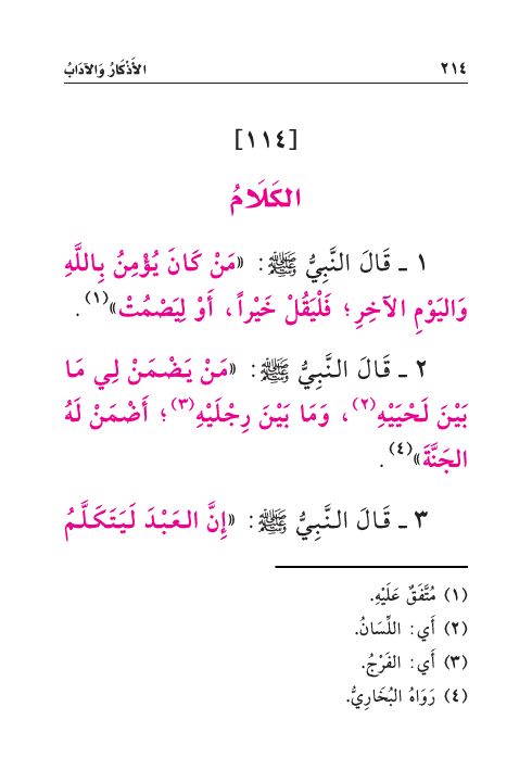 ١ - قَالَ النَّبِيُّ صَلَّى اللهُ عَلَيْهِ وَسَلَّمَ: «مَنْ كَانَ يُؤْمِنُ بِاللَّهِ وَاليَوْمِ الآخِرِ؛ فَلْيَقُلْ خَيْراً، أَوْ لِيَصْمُتْ» (¬١) .