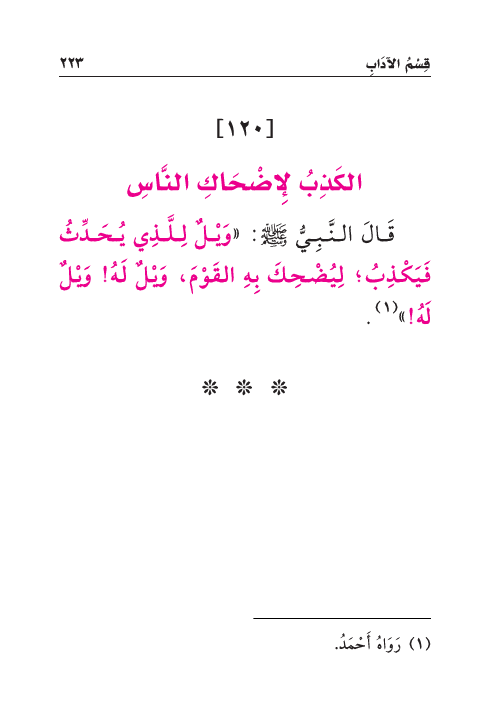 قَالَ النَّبِيُّ صَلَّى اللهُ عَلَيْهِ وَسَلَّمَ: «وَيْلٌ لِلَّذِي يُحَدِّثُ فَيَكْذِبُ؛ لِيُضْحِكَ بِهِ القَوْمَ، وَيْلٌ لَهُ! وَيْلٌ لَهُ!» (¬١) .