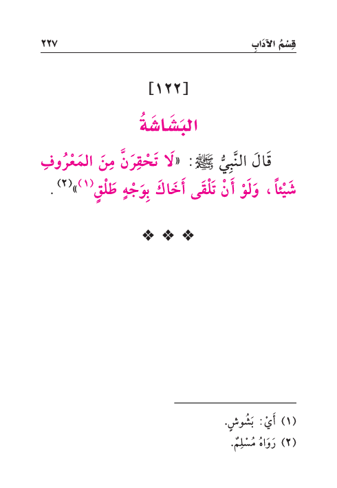 قَالَ النَّبِيُّ صَلَّى اللهُ عَلَيْهِ وَسَلَّمَ: «لَا تَحْقِرَنَّ مِنَ المَعْرُوفِ شَيْئاً، وَلَوْ أَنْ تَلْقَى أَخَاكَ بِوَجْهٍ طَلْقٍ (¬١) » (¬٢) .