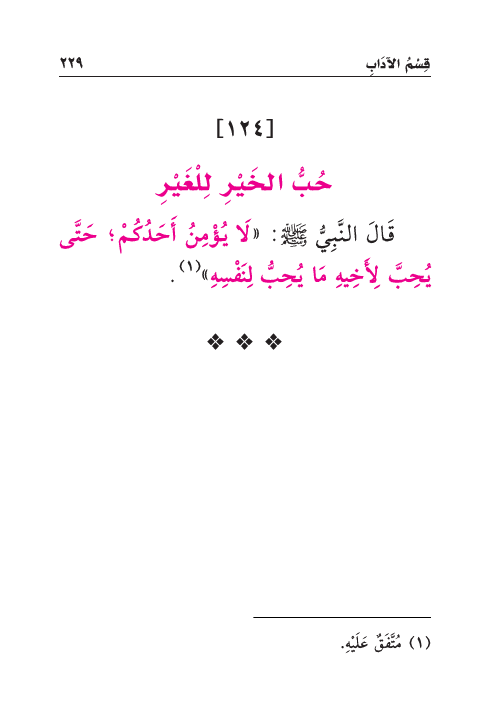 قَالَ النَّبِيُّ صَلَّى اللهُ عَلَيْهِ وَسَلَّمَ: «لَا يُؤْمِنُ أَحَدُكُمْ؛ حَتَّى يُحِبَّ لِأَخِيهِ مَا يُحِبُّ لِنَفْسِهِ» (¬١) .