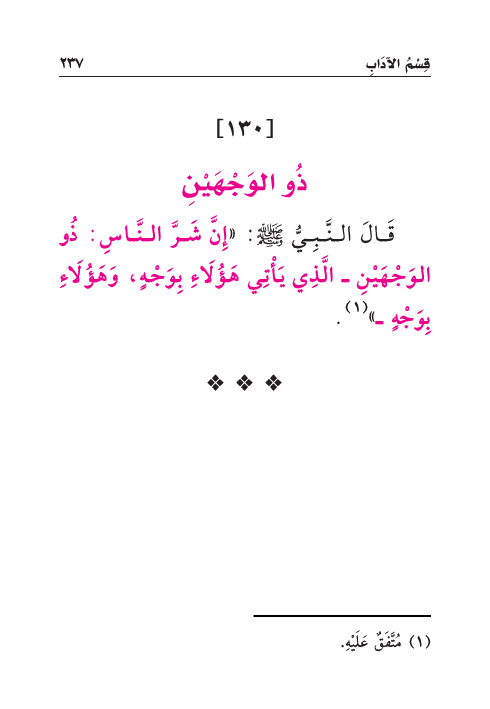 قَالَ النَّبِيُّ صَلَّى اللهُ عَلَيْهِ وَسَلَّمَ: «إِنَّ شَرَّ النَّاسِ: ذُو الوَجْهَيْنِ - الَّذِي يَأْتِي هَؤُلَاءِ بِوَجْهٍ، وَهَؤُلَاءِ بِوَجْهٍ -» (¬١) .