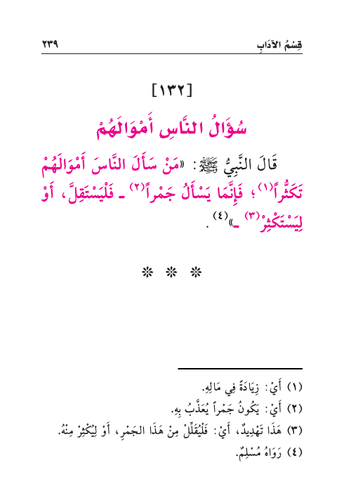 قَالَ النَّبِيُّ صَلَّى اللهُ عَلَيْهِ وَسَلَّمَ: «مَنْ سَأَلَ النَّاسَ أَمْوَالَهُمْ تَكَثُّراً (¬١) ؛ فَإِنَّمَا يَسْأَلُ جَمْراً (¬٢) - فَلْيَسْتَقِلَّ، أَوْ لِيَسْتَكْثِرْ (¬٣) -» (¬٤) .