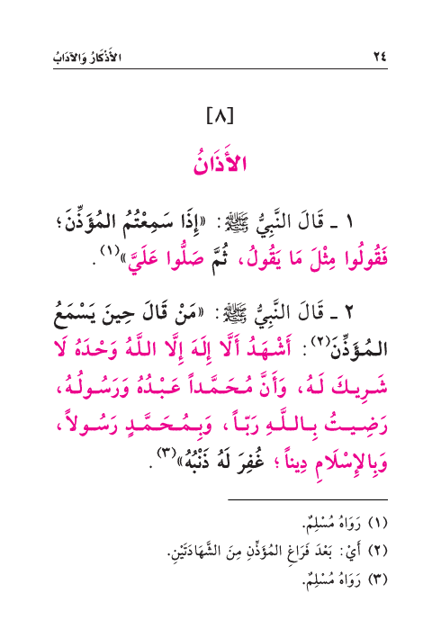 ٢ - قَالَ النَّبِيُّ صَلَّى اللهُ عَلَيْهِ وَسَلَّمَ: «مَنْ قَالَ حِينَ يَسْمَعُ المُؤَذِّنَ (¬٢) : أَشْهَدُ ألَّا إِلَهَ إِلَّا اللَّهُ وَحْدَهُ لَا شَرِيكَ لَهُ، وَأَنَّ مُحَمَّداً عَبْدُهُ وَرَسُولُهُ، رَضِيتُ بِاللَّهِ رَبّاً، وَبِمُحَمَّدٍ رَسُولاً، وَبِالإِسْلَامِ دِيناً؛ غُفِرَ لَهُ ذَنْبُهُ» (¬٣) .