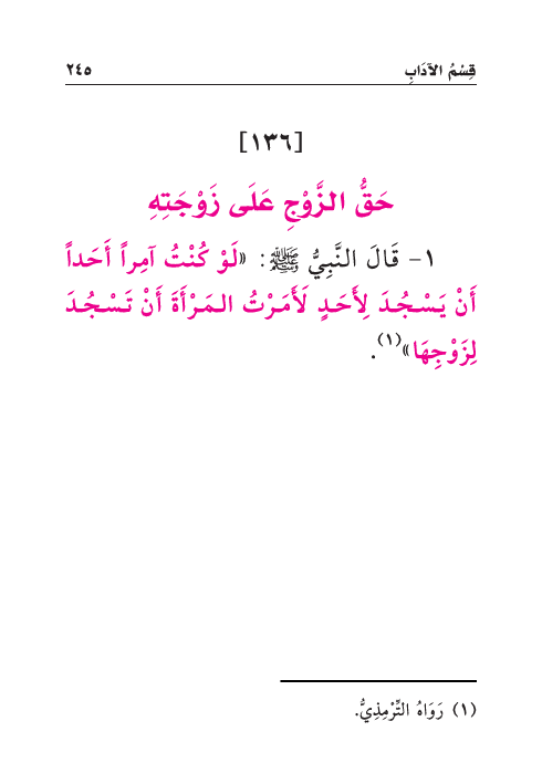 ١ - قَالَ النَّبِيُّ صَلَّى اللهُ عَلَيْهِ وَسَلَّمَ: «لَوْ كُنْتُ آمِراً أَحَداً أَنْ يَسْجُدَ لِأَحَدٍ لَأَمَرْتُ المَرْأَةَ أَنْ تَسْجُدَ لِزَوْجِهَا» (¬١) .
