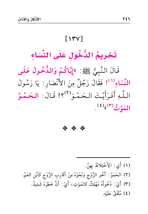 قَالَ النَّبِيُّ صَلَّى اللهُ عَلَيْهِ وَسَلَّمَ: «إِيَّاكُمْ وَالدُّخُولَ عَلَى النِّسَاءِ (¬١) ! فَقَالَ رَجُلٌ مِنَ الأَنْصَارِ: يَا رَسُولَ اللَّهِ أَفَرَأَيْتَ الحَمْوَ (¬٢) ؟! قَالَ: الحَمْوُ المَوْتُ (¬٣) » (¬٤) .
