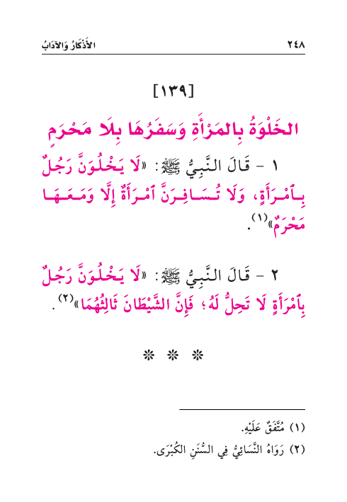 ١ - قَالَ النَّبِيُّ صَلَّى اللهُ عَلَيْهِ وَسَلَّمَ: «لَا يَخْلُوَنَّ رَجُلٌ بِامْرَأَةٍ، وَلَا تُسَافِرَنَّ امْرَأَةٌ إِلَّا وَمَعَهَا مَحْرَمٌ» (¬١) .