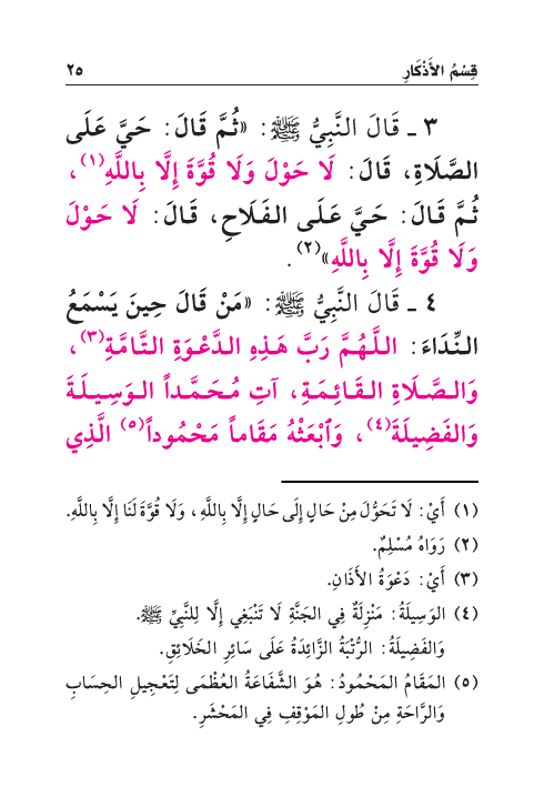 ٣ - قَالَ النَّبِيُّ صَلَّى اللهُ عَلَيْهِ وَسَلَّمَ: «ثُمَّ قَالَ: حَيَّ عَلَى الصَّلَاةِ، قَالَ: لَا حَوْلَ وَلَا قُوَّةَ إِلَّا بِاللَّهِ (¬١) ، ثُمَّ قَالَ: حَيَّ عَلَى الفَلَاحِ، قَالَ: لَا حَوْلَ وَلَا قُوَّةَ إِلَّا بِاللَّهِ» (¬٢) .