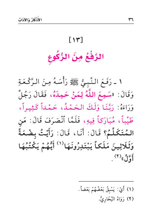 ١ - رَفَعَ النَّبِيُّ صَلَّى اللهُ عَلَيْهِ وَسَلَّمَ رَأْسَهُ مِنَ الرَّكْعَةِ وَقَالَ: «سَمِعَ اللَّهُ لِمَنْ حَمِدَهُ، فَقَالَ رَجُلٌ وَرَاءَهُ: رَبَّنَا وَلَكَ الحَمْدُ، حَمْداً كَثِيراً، طَيِّباً، مُبَارَكاً فِيهِ، فَلَمَّا انْصَرَفَ قَالَ: مَنِ المُتَكَلِّمُ؟ قَالَ: أَنَا، قَالَ: رَأَيْتُ بِضْعَةً وَثَلَاثِينَ مَلَكاً يَبْتَدِرُونَهَا (¬١) أَيُّهُمْ يَكْتُبُهَا أَوَّلُ» (¬٢) .