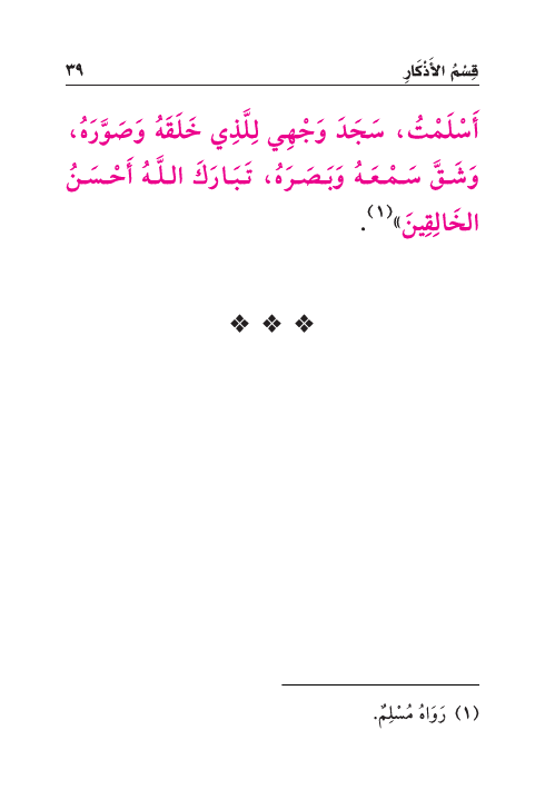 أَسْلَمْتُ، سَجَدَ وَجْهِي لِلَّذِي خَلَقَهُ وَصَوَّرَهُ، وَشَقَّ سَمْعَهُ وَبَصَرَهُ، تَبَارَكَ اللَّهُ أَحْسَنُ الخَالِقِينَ» (¬١) .