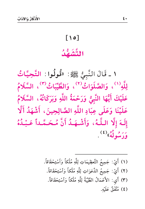 ١ - قَالَ النَّبِيُّ صَلَّى اللهُ عَلَيْهِ وَسَلَّمَ: «قُولُوا: التَّحِيَّاتُ لِلَّهِ (¬١) ، وَالصَّلَوَاتُ (¬٢) ، وَالطَّيِّبَاتُ (¬٣) ، السَّلَامُ عَلَيْكَ أَيُّهَا النَّبِيُّ وَرَحْمَةُ اللَّهِ وَبَرَكَاتُهُ، السَّلَامُ عَلَيْنَا وَعَلَى عِبَادِ اللَّهِ الصَّالِحِينَ، أَشْهَدُ ألَّا إِلَهَ إِلَّا اللَّهُ، وَأَشْهَدُ أَنَّ مُحَمَّداً عَبْدُهُ وَرَسُولُهُ» (¬٤) .