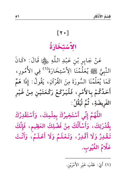 اللَّهُمَّ إِنِّي أَسْتَخِيرُكَ بِعِلْمِكَ، وَأَسْتَقْدِرُكَ بِقُدْرَتِكَ، وَأَسْأَلُكَ مِنْ فَضْلِكَ العَظِيمِ، فَإِنَّكَ تَقْدِرُ وَلَا أَقْدِرُ، وَتَعْلَمُ وَلَا أَعْلَمُ، وَأَنْتَ عَلَّامُ الغُيُوبِ.