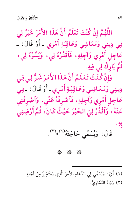 (¬١) أَيْ: وَيُسَمِّي فِي الدُّعَاءِ الأَمْرَ الَّذِي يَسْتَخِيرُ مِنْ أَجْلِهِ.