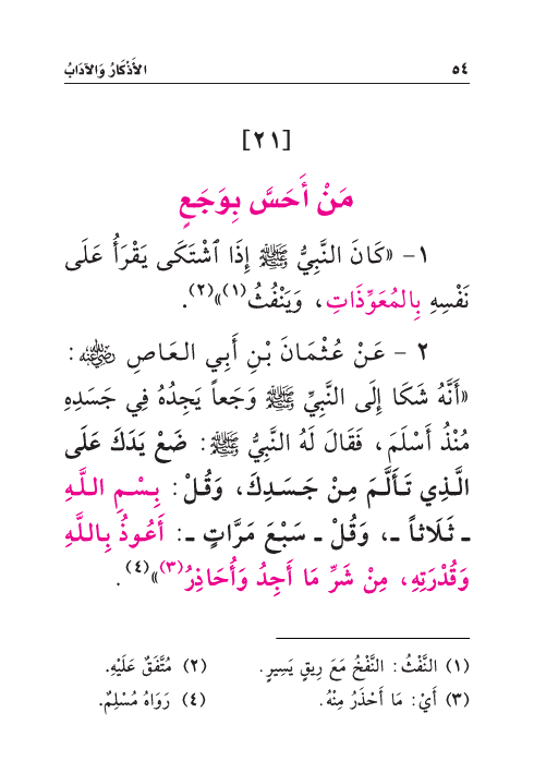 ٢ - عَنْ عُثْمَانَ بْنِ أَبِي العَاصِ رَضِيَ اللهُ عَنْهُ: «أَنَّهُ شَكَا إِلَى النَّبِيِّ صَلَّى اللهُ عَلَيْهِ وَسَلَّمَ وَجَعاً يَجِدُهُ فِي جَسَدِهِ مُنْذُ أَسْلَمَ، فَقَالَ لَهُ النَّبِيُّ صَلَّى اللهُ عَلَيْهِ وَسَلَّمَ: ضَعْ يَدَكَ عَلَى الَّذِي تَأَلَّمَ مِنْ جَسَدِكَ، وَقُلْ: بِسْمِ اللَّهِ - ثَلَاثاً -، وَقُلْ - سَبْعَ مَرَّاتٍ -: أَعُوذُ بِاللَّهِ وَقُدْرَتِهِ، مِنْ شَرِّ مَا أَجِدُ وَأُحَاذِرُ (¬٣) » (¬٤) .