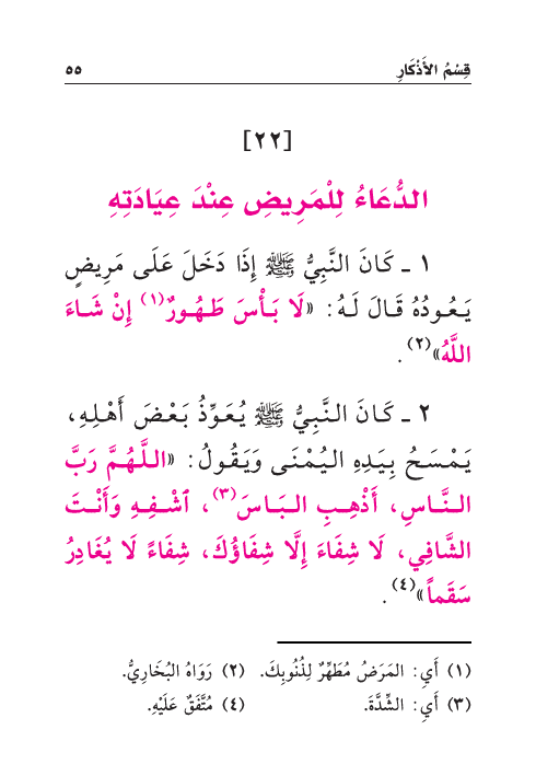 ١ - كَانَ النَّبِيُّ صَلَّى اللهُ عَلَيْهِ وَسَلَّمَ إِذَا دَخَلَ عَلَى مَرِيضٍ يَعُودُهُ قَالَ لَهُ: «لَا بَأْسَ طَهُورٌ (¬١) إِنْ شَاءَ اللَّهُ» (¬٢) .