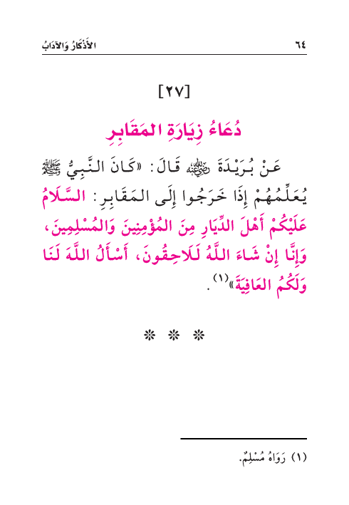 عَنْ بُرَيْدَةَ رَضِيَ اللهُ عَنْهُ قَالَ: «كَانَ النَّبِيُّ صَلَّى اللهُ عَلَيْهِ وَسَلَّمَ يُعَلِّمُهُمْ إِذَا خَرَجُوا إِلَى المَقَابِرِ: السَّلَامُ عَلَيْكُمْ أَهْلَ الدِّيَارِ مِنَ المُؤْمِنِينَ وَالمُسْلِمِينَ، وَإِنَّا إِنْ شَاءَ اللَّهُ لَلَاحِقُونَ، أَسْأَلُ اللَّهَ لَنَا وَلَكُمُ العَافِيَةَ» (¬١) .