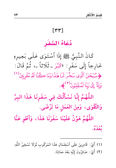 كَانَ النَّبِيُّ صَلَّى اللهُ عَلَيْهِ وَسَلَّمَ إِذَا اسْتَوَى عَلَى بَعِيرِهِ خَارِجاً إِلَى سَفَرٍ: «كَبَّرَ - ثَلَاثاً -، ثُمَّ قَالَ: {سُبْحَانَ الَّذِي سَخَّرَ لَنَا هَذَا وَمَا كُنَّا لَهُ مُقْرِنِينَ (¬١) * وَإِنَّا إِلَى رَبِّنَا لَمُنقَلِبُونَ (¬٢) }.