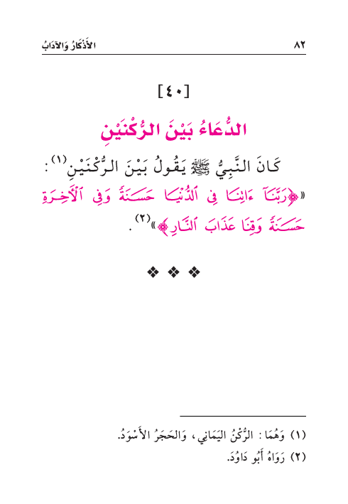 كَانَ النَّبِيُّ صَلَّى اللهُ عَلَيْهِ وَسَلَّمَ يَقُولُ بَيْنَ الرُّكْنَيْنِ (¬١) : «{رَبَّنَا آتِنَا فِي الدُّنْيَا حَسَنَةً وَفِي الْآخِرَةِ حَسَنَةً وَقِنَا عَذَابَ النَّارِ}» (¬٢) .