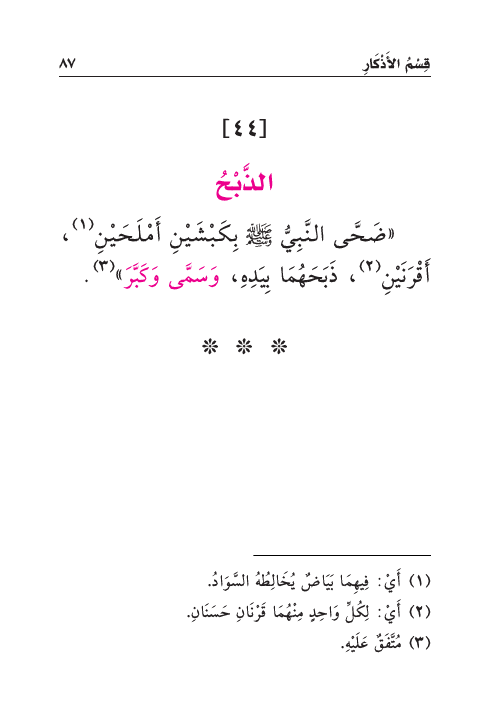 «ضَحَّى النَّبِيُّ صَلَّى اللهُ عَلَيْهِ وَسَلَّمَ بِكَبْشَيْنِ أَمْلَحَيْنِ (¬١) ، أَقْرَنَيْنِ (¬٢) ، ذَبَحَهُمَا بِيَدِهِ، وَسَمَّى وَكَبَّرَ» (¬٣) .