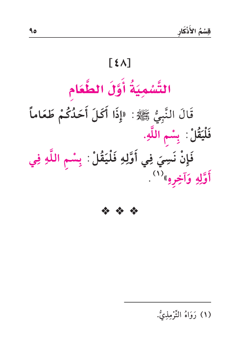 قَالَ النَّبِيُّ صَلَّى اللهُ عَلَيْهِ وَسَلَّمَ: «إِذَا أَكَلَ أَحَدُكُمْ طَعَاماً فَلْيَقُلْ: بِسْمِ اللَّهِ.