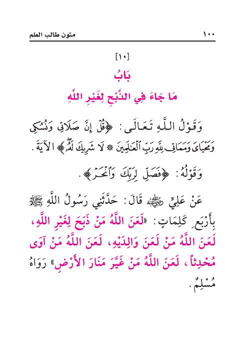 عَنْ عَلِيٍّ رَضِيَ اللهُ عَنْهُ قَالَ: حَدَّثَنِي رَسُولُ اللَّهِ صَلَّى اللهُ عَلَيْهِ وَسَلَّمَ بِأَرْبَعِ كَلِمَاتٍ: «لَعَنَ اللَّهُ مَنْ ذَبَحَ لِغَيْرِ اللَّهِ، لَعَنَ اللَّهُ مَنْ لَعَنَ وَالِدَيْهِ، لَعَنَ اللَّهُ مَنْ آوَى مُحْدِثاً، لَعَنَ اللَّهُ مَنْ غَيَّرَ مَنَارَ الأَرْضِ» رَوَاهُ مُسْلِمٌ.