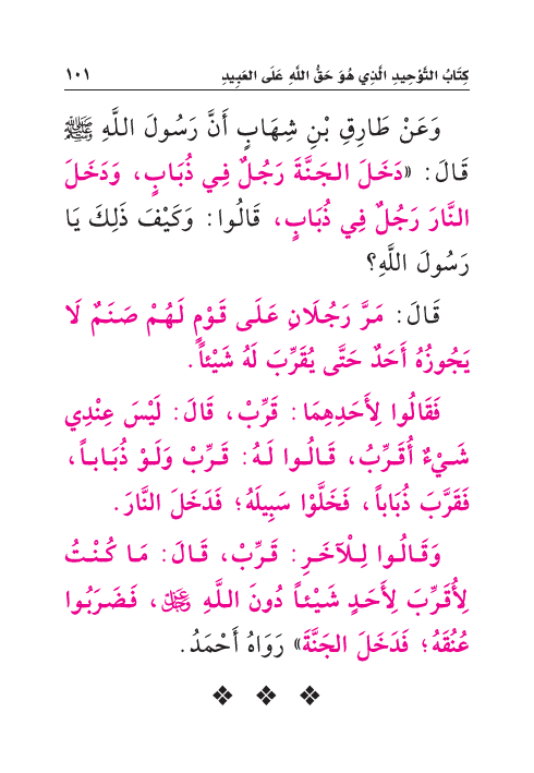 وَعَنْ طَارِقِ بْنِ شِهَابٍ أَنَّ رَسُولَ اللَّهِ صَلَّى اللهُ عَلَيْهِ وَسَلَّمَ قَالَ: «دَخَلَ الجَنَّةَ رَجُلٌ فِي ذُبَابٍ، وَدَخَلَ النَّارَ رَجُلٌ فِي ذُبَابٍ، قَالُوا: وَكَيْفَ ذَلِكَ يَا رَسُولَ اللَّهِ؟