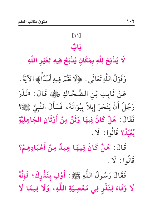 عَنْ ثَابِتِ بْنِ الضَّحَّاكِ رَضِيَ اللهُ عَنْهُ قَالَ: «نَذَرَ رَجُلٌ أَنْ يَنْحَرَ إِبِلاً بِبُوَانَةَ، فَسَأَلَ النَّبِيَّ صَلَّى اللهُ عَلَيْهِ وَسَلَّمَ؟ فَقَالَ: هَلْ كَانَ فِيهَا وَثَنٌ مِنْ أَوْثَانِ الجَاهِلِيَّةِ يُعْبَدُ؟ قَالُوا: لَا.